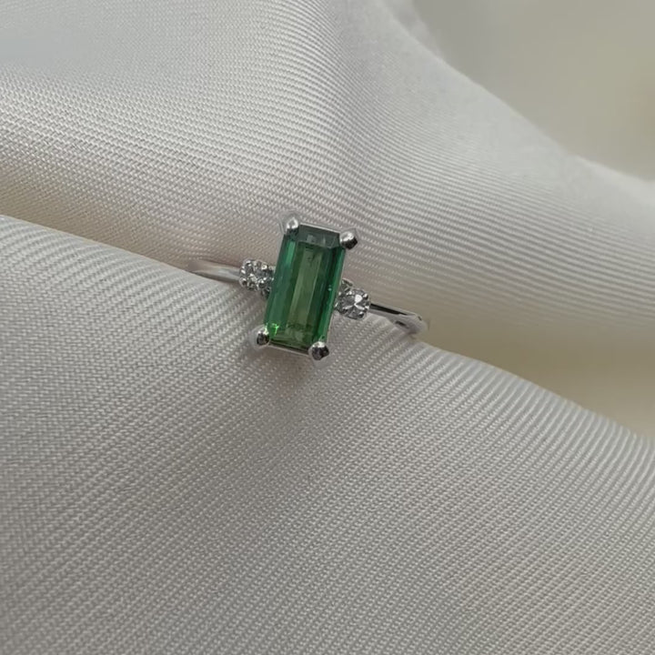 From our pre-owned vintage collection, this delicate three stone ring features 2 small round diamonds on the shoulders of a baguette cut green Tourmaline.
