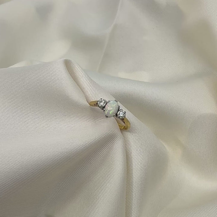 From our pre-owned vintage collection, this 18ct yellow gold classic ring has a trilogy of a larger central oval opal and two diamonds set in Platinum.