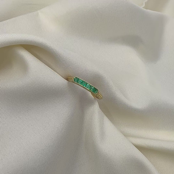 From our pre-owned vintage collection, this 18ct yellow gold ring features six princess cut emeralds set in a milgrain channel setting. The art deco inspired ring features delicate floral engraving on a tapered band.
