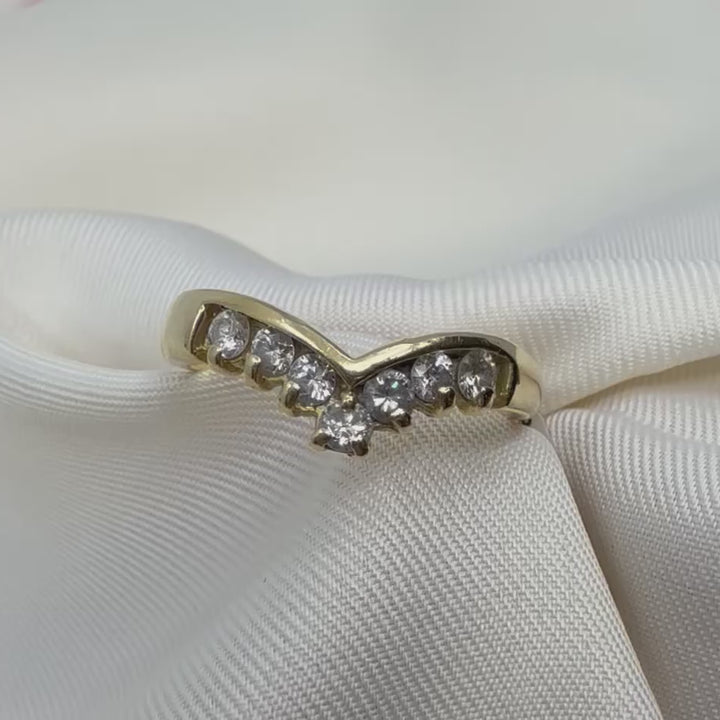 From our pre-owned vintage collection, this classic diamond wishbone ring displays 7 round diamonds claw set in a 'V' formation. The perfect choice for a shaped to fit wedding or eternity ring.