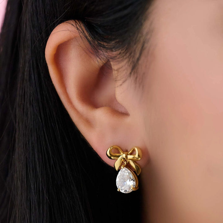 These fun, sculptural pieces were designed to add a pop of personality to any outfit and bring the wearer a real glimmer of joy each time they put the statement styles on. This elegant earring style feature a hand crafted ribbon style bow that holds onto a radiant teardrop lab grown cubic zirconia.