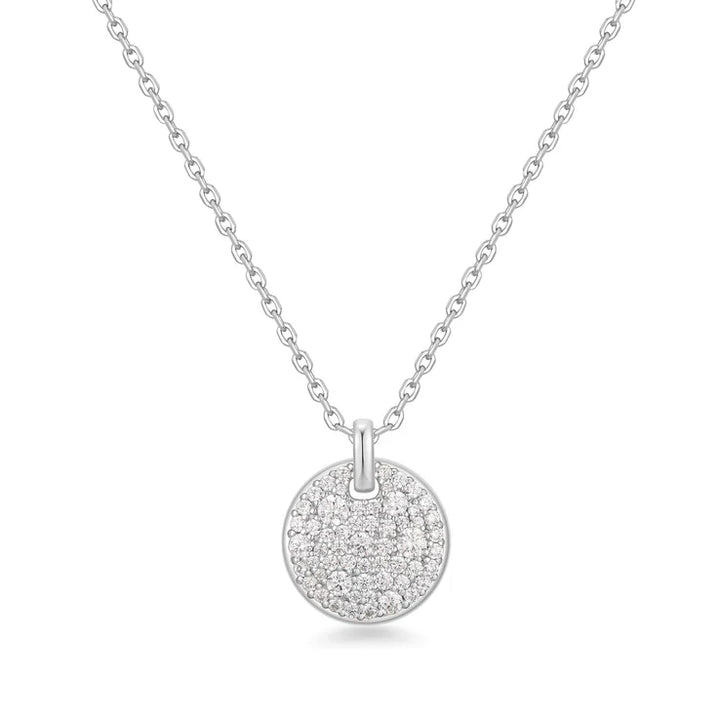 Elevate your style with this chic and eye-catching pavé disc necklace. Designed to shine brilliantly, it adds a dramatic yet subtle touch to any outfit. Pair it with a pearl necklace and a chunky chain to make a strong impression. Whether for special occasions or everyday wear, this necklace ensures you stand out with sophistication and poise.