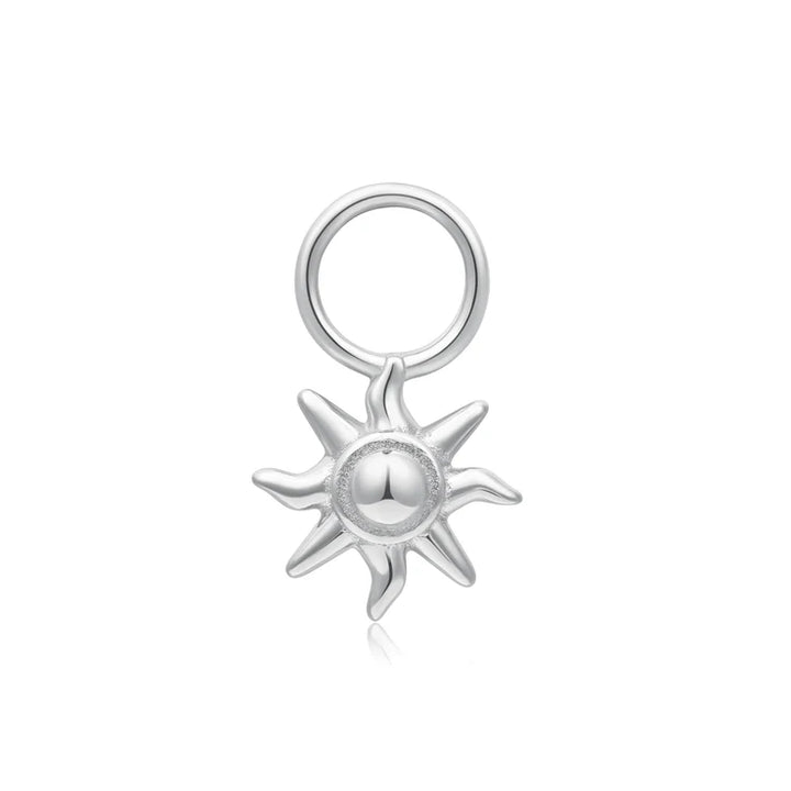 The perfect addition to any earring collection, discover the silver sunshine earring charm, crafted in sterling silver plated in shiny rhodium. This shimmering sun charm simply slips onto your chosen hoop or huggie earring to transform a classic look into a seasonal essential. Wear asymmetrically or opt for two to create a matching set and stack with your go-to studs.