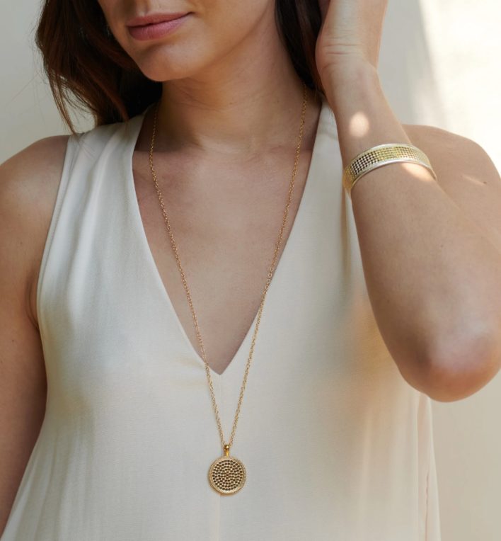 A stunning display of Balinese metalsmithing—each dot is punched and set by hand, a generations-old technique that infuses our designs with love and intention. Our large-format gold pendant is perfect for statement-making.