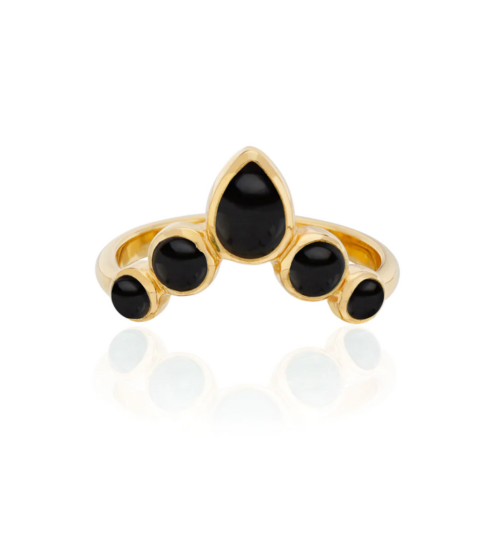 A V-shape setting and plenty of curves evoke a sense of femininity in this design. With round and pear-shaped black onyx stones and a smooth, rich gold band.