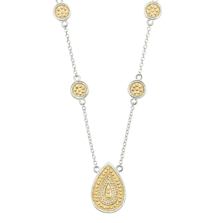 The Signature Teardrop Pendant by Anna Beck is a statement piece with a beautifully crafted teardrop charm. The fine detailing and the weighty design make it an elegant addition to any jewellery collection.