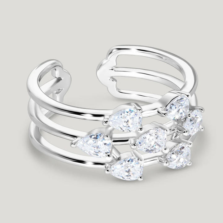 This stunning yet simple ring features delicate Pear-Cut stones set on three parallel bands that resemble falling rain sparkling in the light. With its lightweight feel and glittering sparkle, this piece is equally suited for day or night.