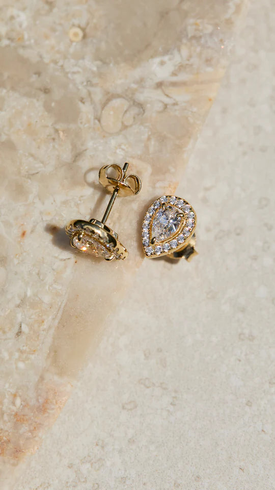 These cute studs feature an exquisite border setting and pear-cut centre stone. Wear them as your everyday basic.