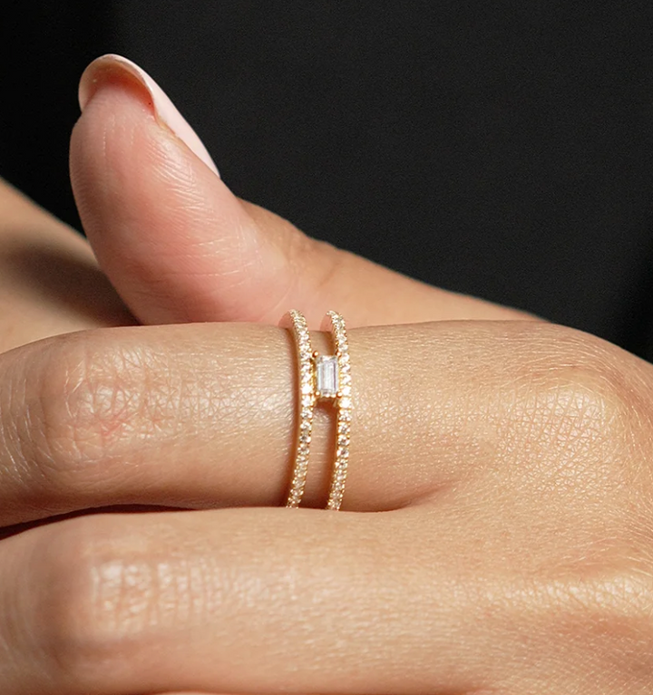 This cute little every day is embellished with the baguette cut centre stone and micro setting details. Wear it alone to elevate the everyday. It is easily paired with the other pieces from the collection.