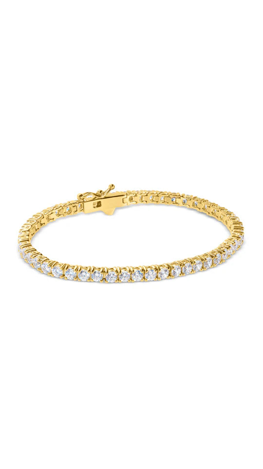 Vianne is the mid-size stone tennis bracelet. This Tennis Bracelet is a classic staple for every jewellery collection. Set in Sterling Silver with a yellow gold vermeil finish, it features exquisitely cut and polished round brilliant stones formed in a simple line design, offering the perfect mix of glamour and sophistication.