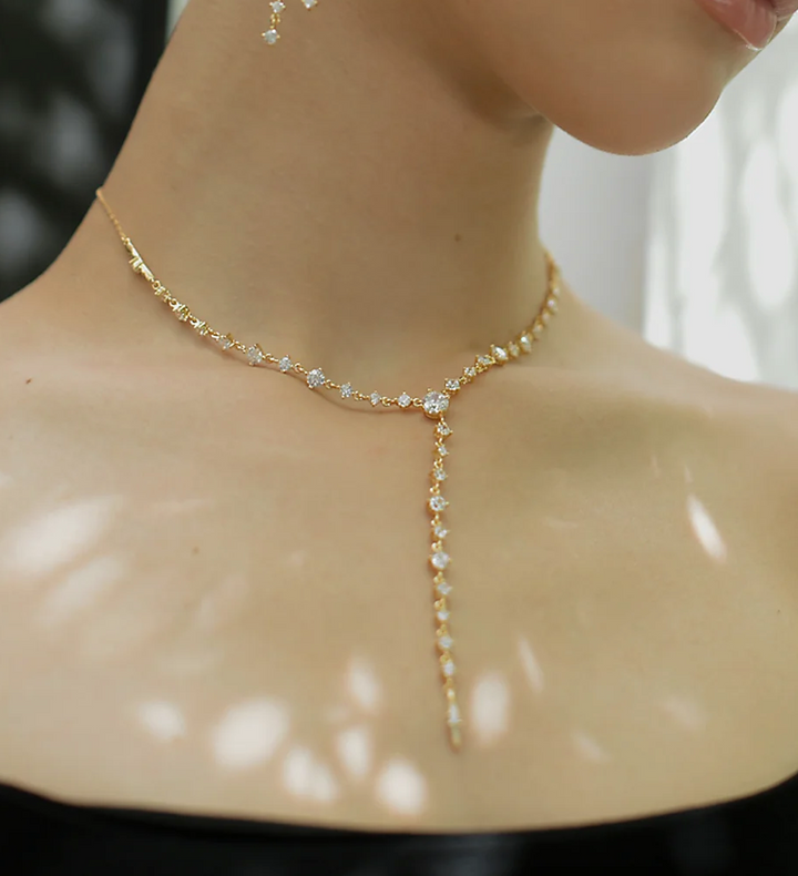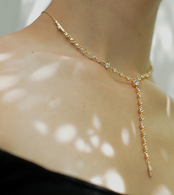 Varying-sized brilliant-cut rounds dance along a handmade, fully articulated chain. This necklace is a great evening-wear look for added drama to a simple outfit.