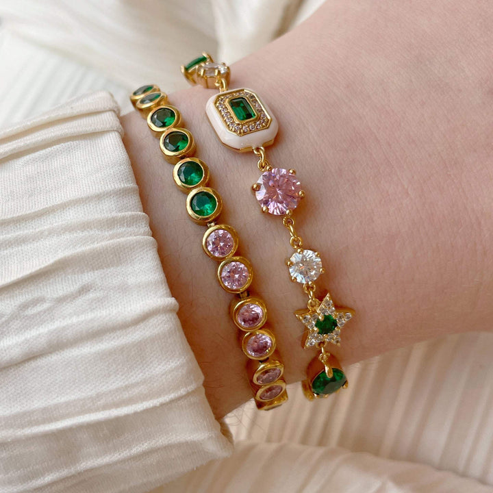 The perfect balance of colour and sparkle, this gold-plated star bracelet is ideal for layering with our other pink and emerald green jewellery pieces, or wearing solo for a statement look. Whether you’re dressing up for a special occasion or adding a dreamy celestial touch to your everyday style, this cosmic-inspired bracelet is sure to leave everyone starstruck!