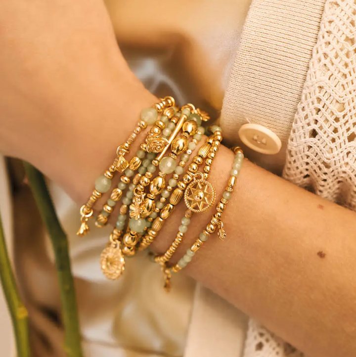 This enchanting stack of 3 bracelets reflects a Parisian springtime of new and blooming growth, with beads of aventurine to bring the wearer luck and positivity as they embrace a fresh perspective this season. Wear this striking combination of charms, featuring flowers and a wheel of luck, to attract abundance and prosperity to your life.