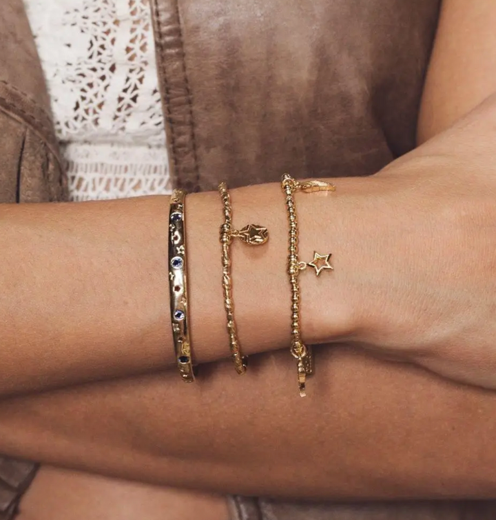 This positively charged bracelet is a dream to layer up your stack with. This style incorporates delicately textured beads and a star embossed disc charm.