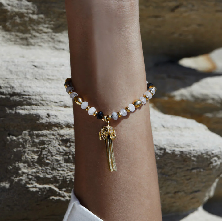 Construct and protect your positive energies as you embark on your spiritual journey. Featuring an intricate new mandala tassel charm, wear this piece to dispel negative energies as you find connections in the greater universe. Laced with the monochromatic hues of black rutilated quartz, this piece will bring a striking look to your wrist stack.