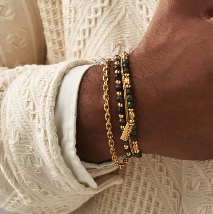 This alternating design of textured beads and green kambaba jasper will be your new go-to accessory. Featuring a subtle pop of colour this piece is perfect for the everyday man, whether worn as a standalone piece or to add depth to an existing stack, this bracelet will elevate your style.