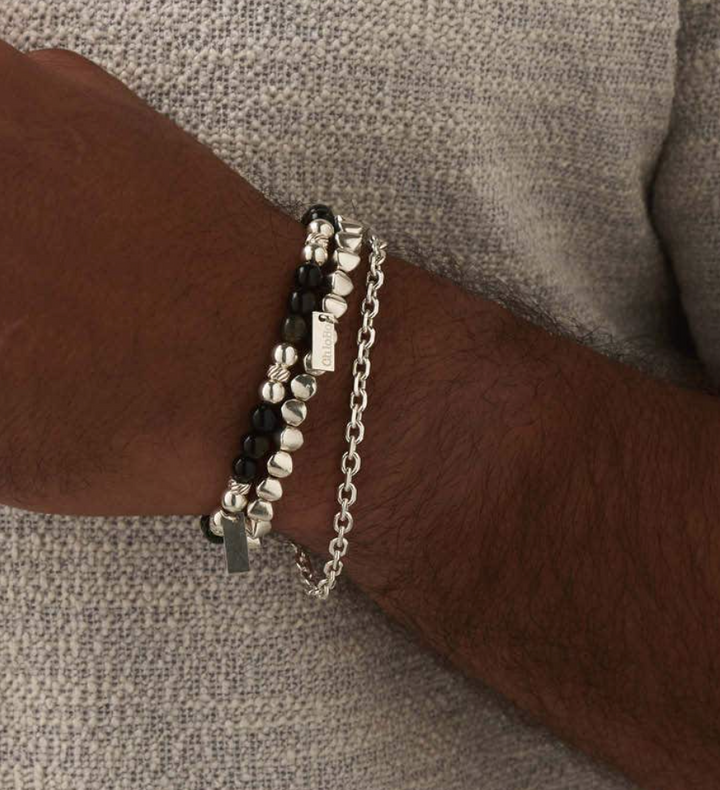 This alternating three bead design is the ultimate accessory for a sleek, but impactful style. Featuring 925 sterling silver or 18ct gold plated beads with alternating stones of golden obsidian, this piece will add depth and texture to your signature ChloBo MAN stack with its deep, warm hues.