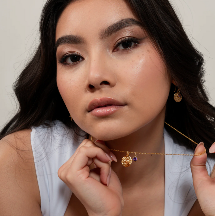 Exuding understated elegance, this sterling silver piece has a rich 18ct yellow gold vermeil finish and features a radiant amethyst encased in rub-over setting, layered with a round disc that bears our signature hammered texture. The pendants are suspended together on fine chain, complete with our signature quatrefoil lobster catch.