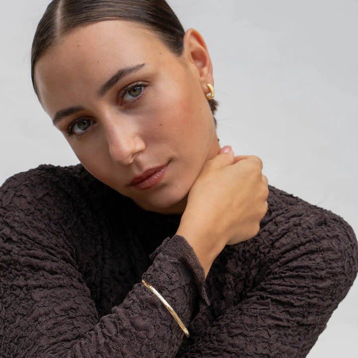 A fresh take on a classic huggie, these hinged sterling silver humbug stripe style hoops are carved with a unique ribbed design. The hoops are complete with a radiant yellow gold vermeil finish that will have you shining!