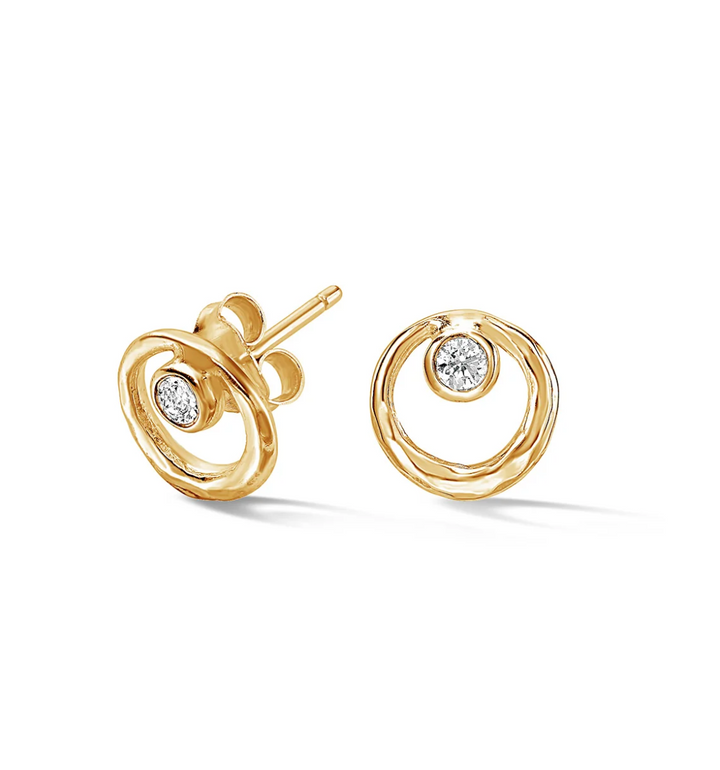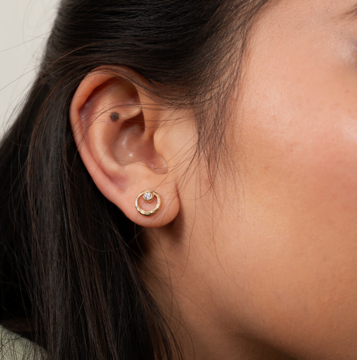 18ct yellow gold vermeil on a pair of sterling silver White Sapphire 9mm open circle studs with a post and butterfly back. Organically inspired, the studs have a soft beaten finish that complements the sparkle of the faceted sapphire stones – designed to evoke the purity of fresh morning dew.