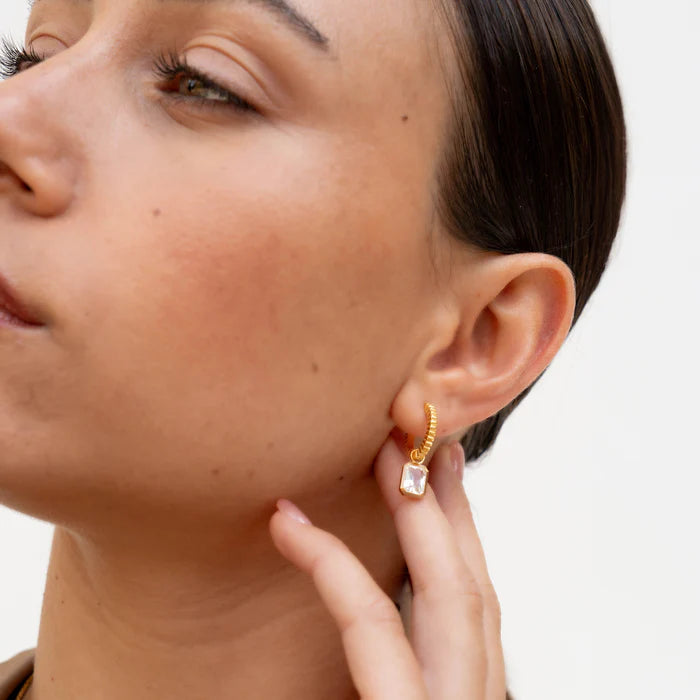 Made from sterling silver with a yellow gold vermeil finish, these 2mm hinged humbug stripe style hoops feature octagon white topaz gemstones that will go with absolutely everything you wear. The earrings are perfect as a standalone piece or a new addition to your ear stack.