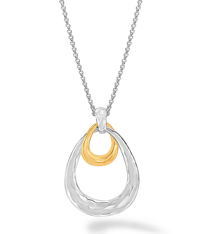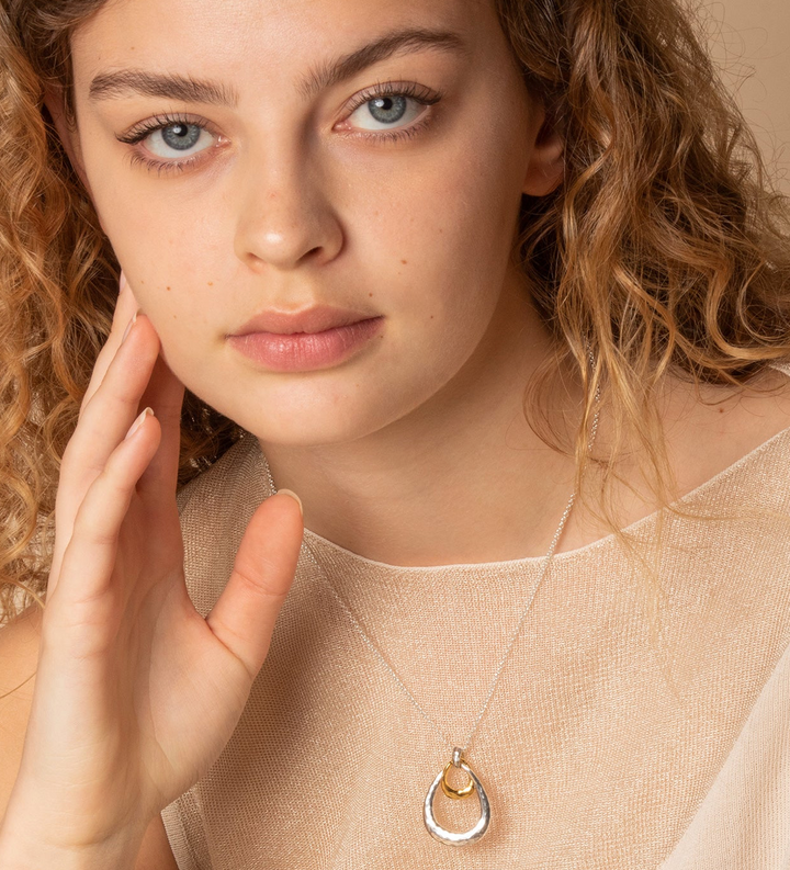 This mixed 18ct yellow gold vermeil and sterling silver pendant is made up of 2 open interlocking ovals on a fine chain, finished with our quatrefoil catch. Symbolising eternal love, the entwined pendant features our signature hammered finish that perfectly complements the curved shapes that this collection beholds.
