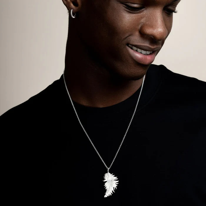 Handcrafted in the London studio, this sterling silver large feather pendant is suspended on a fine belcher chain finished with a signature quatrefoil lobster catch.