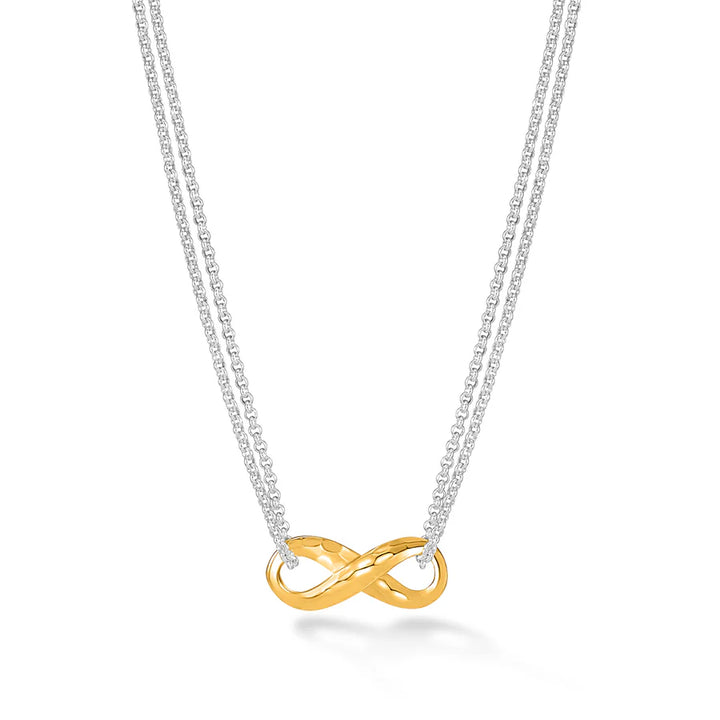 This sterling silver pendant features a yellow gold vermeil infinity symbol on a fine double chain, finished with our lobster catch. Representing eternal love, the infinity pendant features our signature hammered finish that perfectly complements the curved shapes that this collection beholds.