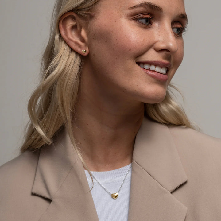 This sterling silver pendant features an organic shaped heart with a subtle dimpled texture and a radiant 18ct yellow gold vermeil finish. The heart is suspended on a fine chain, finished with our signature tag & lobster catch.