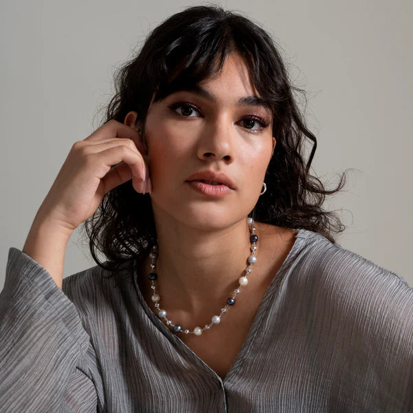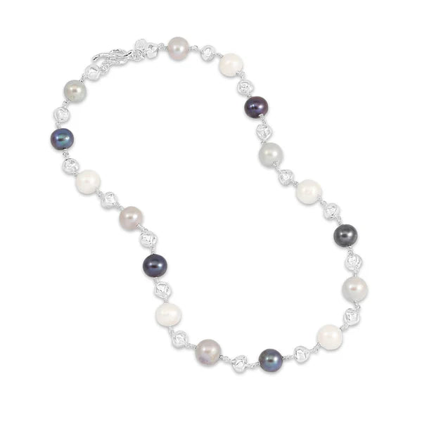 From the Luna Pearls range, this necklace features mixed cultured freshwater pearls in white, dove grey and peacock shades, interspaced with 7 sterling silver nuggets. The 5mm nuggets have a soft beaten finish, giving the necklace an organic yet contemporary feel. The necklace is finished with a signature beaten loop and t-bar catch.