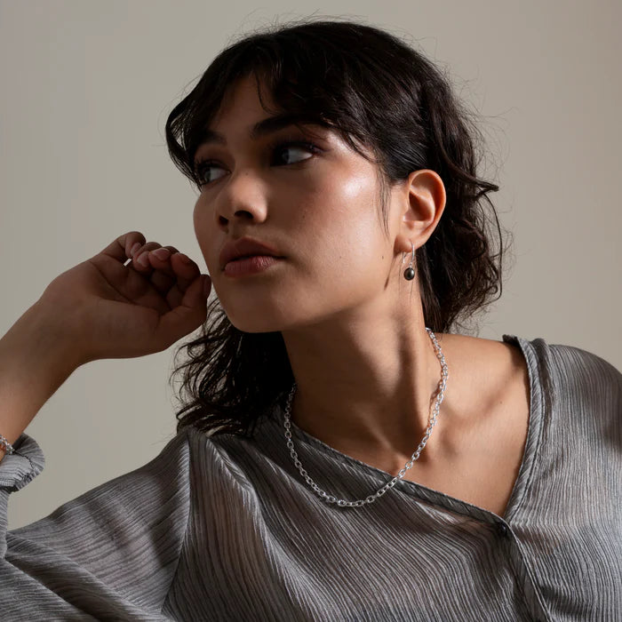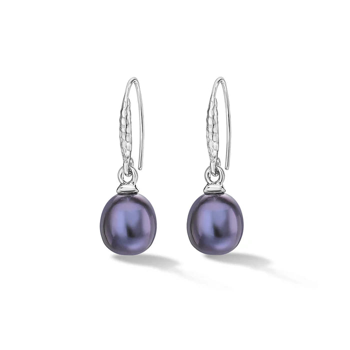 Showcasing classic pearls with a modern twist, this pair of sterling silver earrings feature oval peacock freshwater pearls hanging from contemporary oval hammered ear wires.