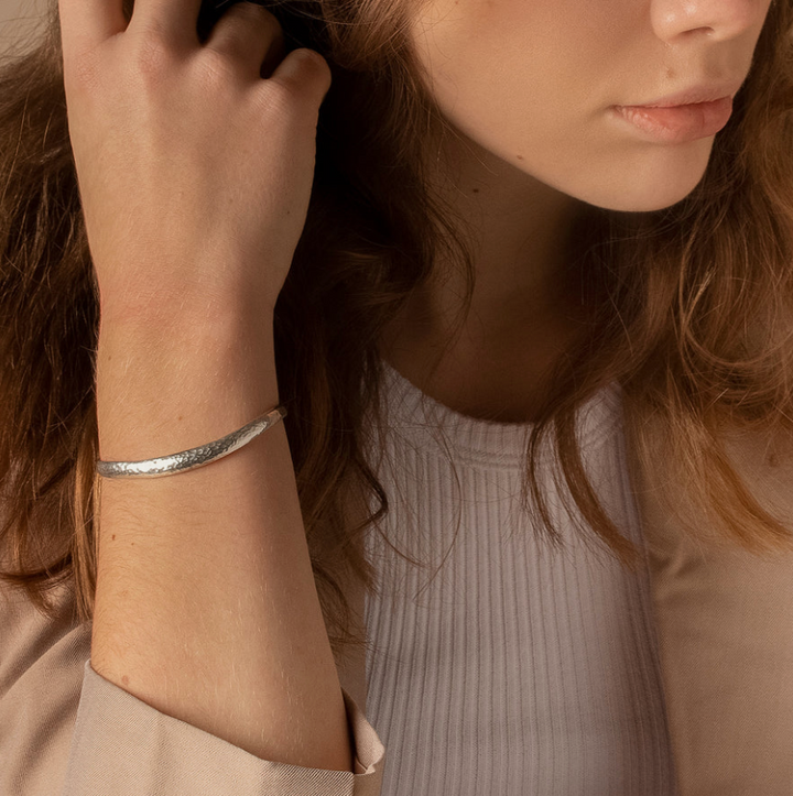 A sterling silver curved bangle with a hammered finish.