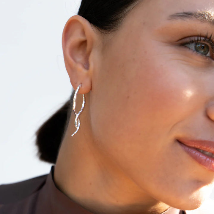 These sculptural hinged hoops have a unique double twist and are a mirror pair, adding fascination to their classic design. Made of sterling silver with our signature hammered texture, wear them solo or paired with other pieces from the Entwined collection.
