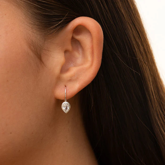 Made from sterling silver, these radiant pear-cut white topaz gemstones on fixed ear wires will catch the sunlight beautifully. The earrings are perfect as a standalone piece or a new addition to your ear stack.