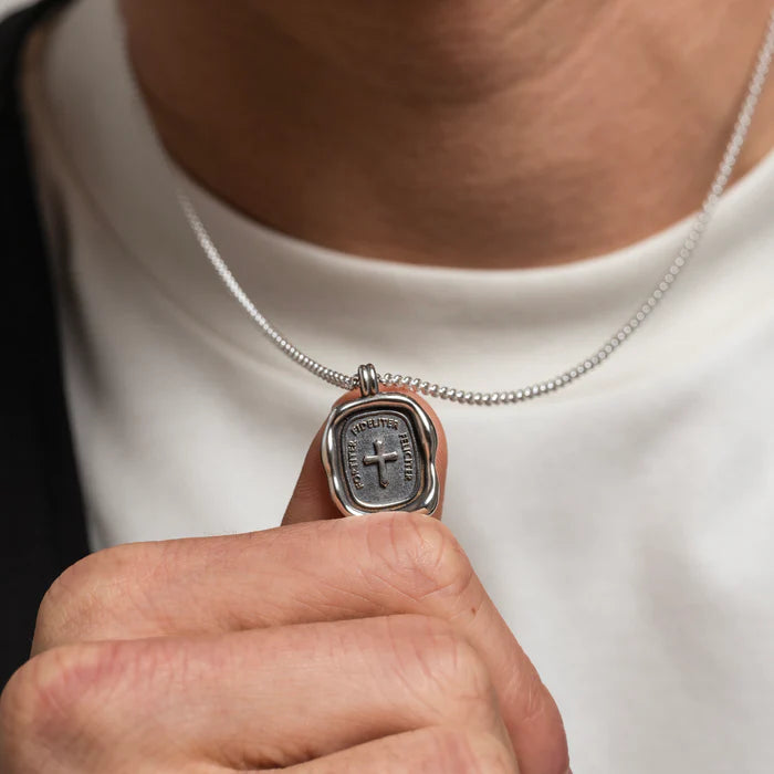 Navigate life’s journey protected and guided by your own collection of amulets and talismans. This sterling silver adjustable Talisman necklace features an oxidised cross pendant, embossed with the words 'Fortiter', 'Fideliter' and 'Feliciter' - meaning bravely, faithfully and successfully.
