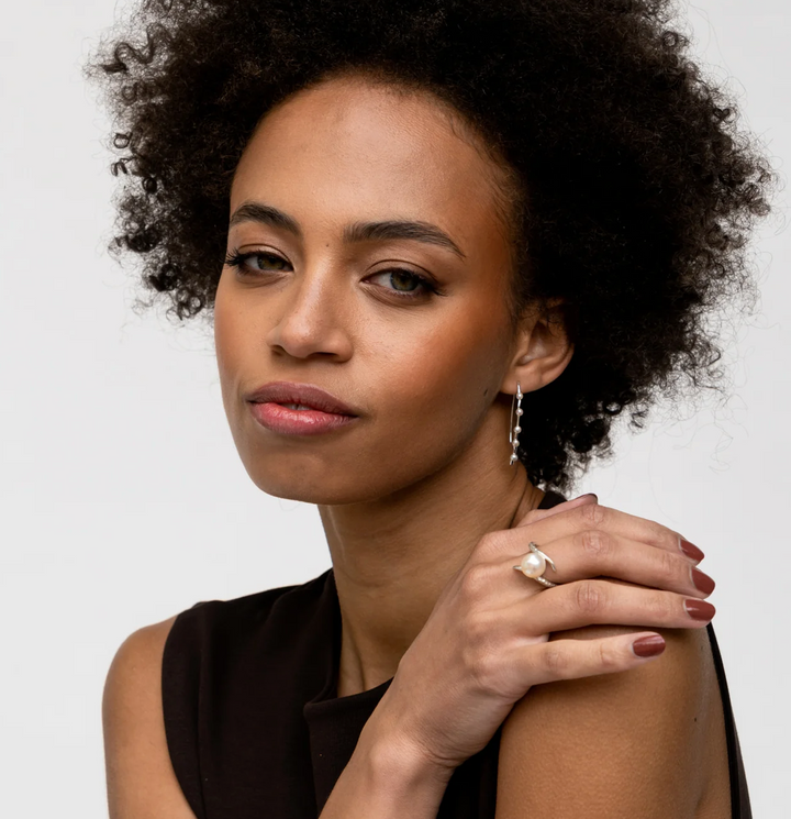 Showcasing classic pearls with a modern twist, this sterling silver ring is set with a large white freshwater pearl on an open style twisted band. The ring is complete with a subtle and contemporary hammered finish.