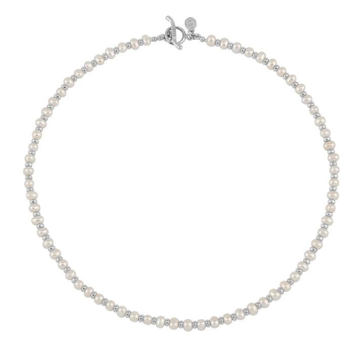 Thread by hand in our London studio, this pearl necklace will slip seamlessly into your collection of style staples. The modern mix of lustrous white freshwater pearls and shiny sterling silver beads makes it perfect for layering with other necklaces and pendants!