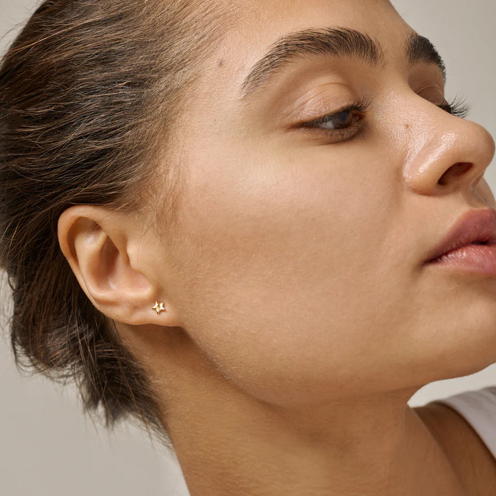 The Star Energy earrings sprinkle stardust on your earlobes, celebrating the joyful and beautiful energy you spread every day. The small, delicate gold earrings sparkle with their polished surface and handcrafted structure.