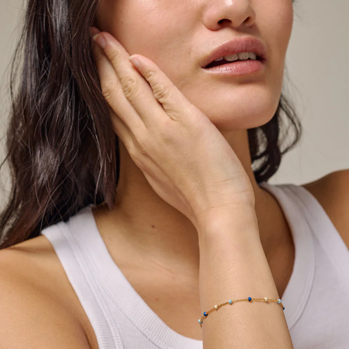 The marine-colored Lola bracelet features various shades of blue and beige enamel along the chain. The marine bracelet is made with hand-painted enamel and crafted in sterling silver with an 18k gold plating. The marine bracelet can be worn alone or with other bracelets from our collection.