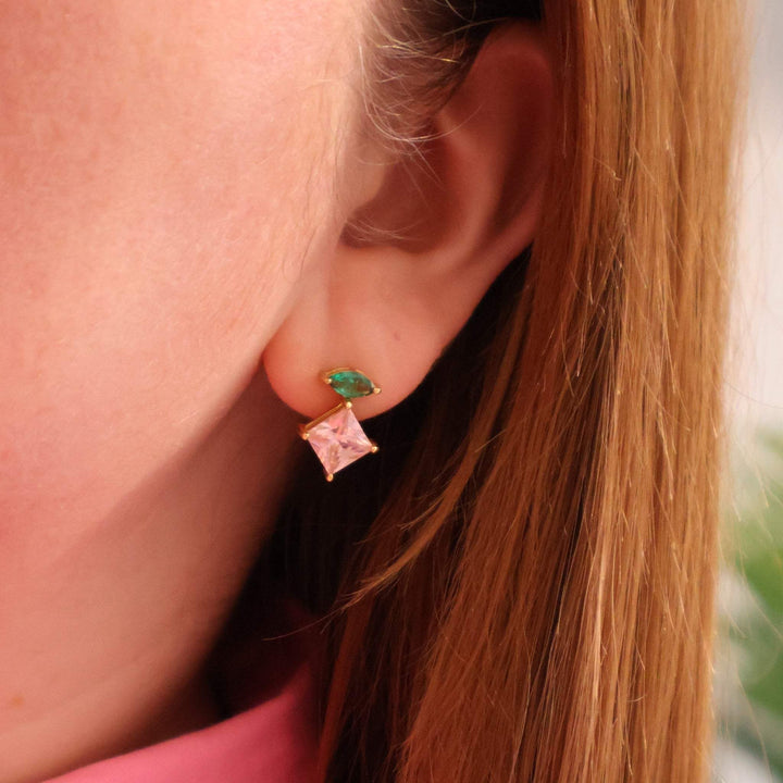 A sparkling statement! If you’re on the hunt for some unusual gold earrings, our Esme studs are an elegant way to add a touch of sparkle to any look, the perfect pair for any occasion. Whether you’re headed to a big event, getting dressed up for a night out, or just looking to add a little sparkle to your everyday style, our Esme studs have you covered. Handcrafted in recycled 925 Sterling Silver, our 18k gold plated studs feature an Emerald Green marquise cut Cubic Zirconia that hugs a statement square cut Rose Pink Cubic Zirconia.