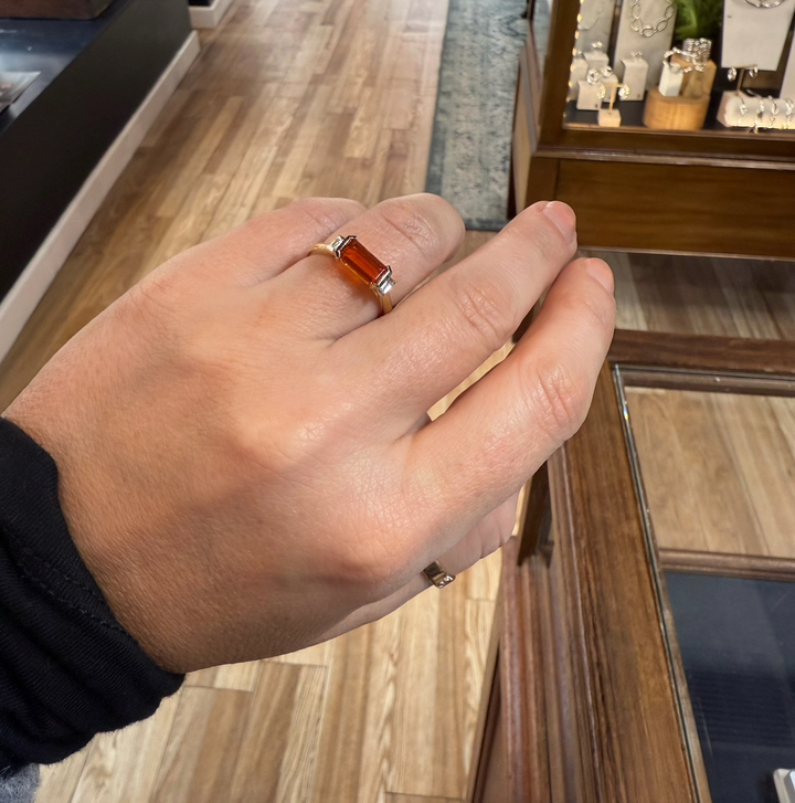 Our 18ct Yellow Gold Ring features a stunning sideways-set baguette-cut orange fire opal, complemented by baguette-cut diamond shoulders. This bold and modern design radiates warmth and sophistication.