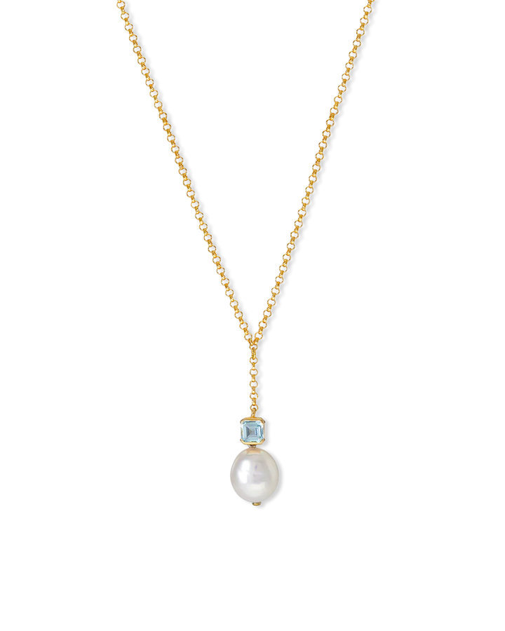 The Bella Pearl Necklace features a hand set freshwater baroque pearl and step cut 'something blue' topaz, a staple in V jewellery and a nod to our Art Deco inspiration. The perfect bridal necklace that sits beautifully on an open décolletage or gift for those celebrating your big day and beyond...