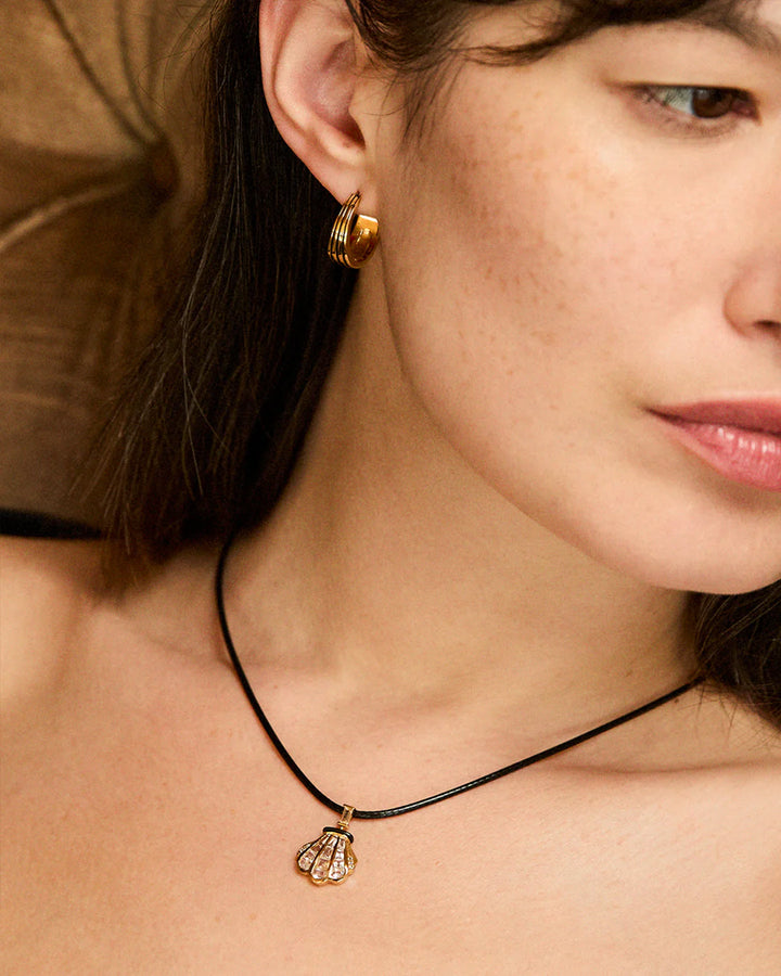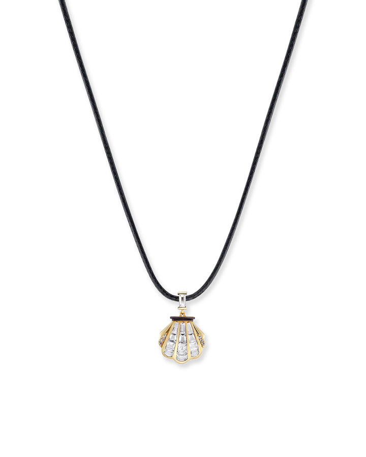 Channelling the architectural spirit of Art Deco through a contemporary lens, this pendant necklace features a sculptural shell form with black-plated detailing and precisely set white topaz. It’s suspended from a semi bezel-set, baguette-cut white topaz on a sleek black cord - a bold interplay of form, contrast, and colour. Striking yet versatile, it brings graphic clarity and a refined edge to everyday styling.
