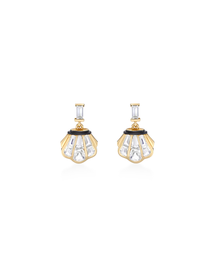 Channelling the architectural spirit of Art Deco through a contemporary lens, the Cleo Earrings feature a sculptural shell form with black-plated detailing and precisely set white topaz. Suspended from a semi bezel-set, baguette-cut white topaz, they offer a bold interplay of form, contrast, and colour. Striking yet versatile, they bring graphic clarity and a refined edge to everyday styling.