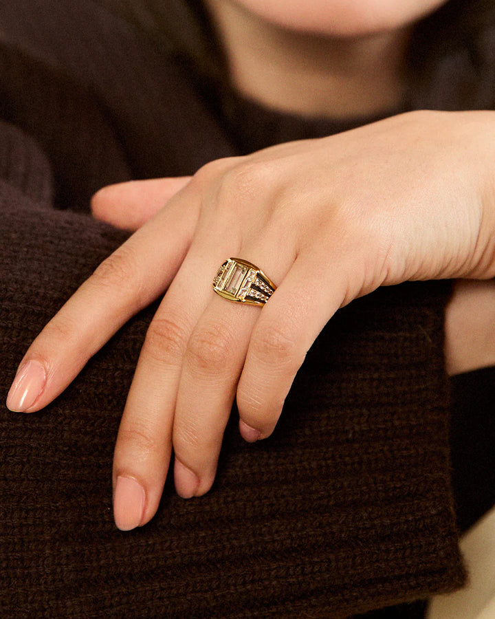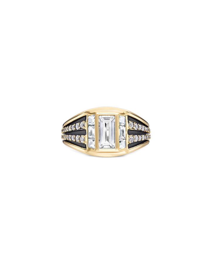 A bold expression of modern Art Deco design, the Freya Ring is a chunky statement piece crafted in 18ct gold vermeil. A central baguette-cut white topaz is framed by six additional baguette-cut white topaz stones, creating a striking sense of symmetry and light. The band is detailed with alternating sections of black plate and round-cut white topaz, offering bold contrast and sculptural depth. Designed to stand out, it’s a refined piece that brings architectural clarity to elevated styling moments.