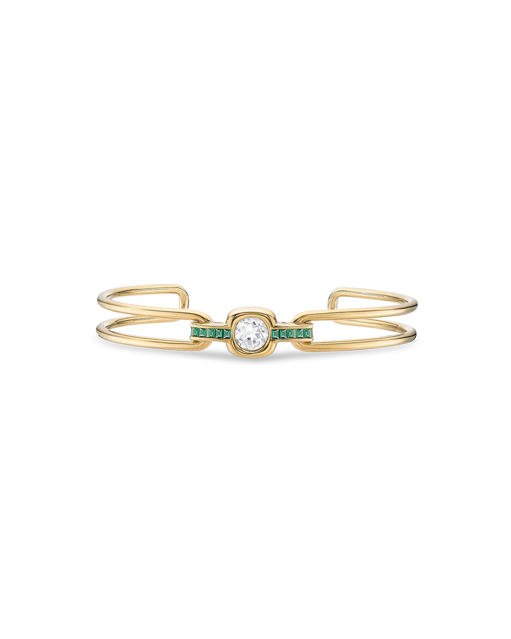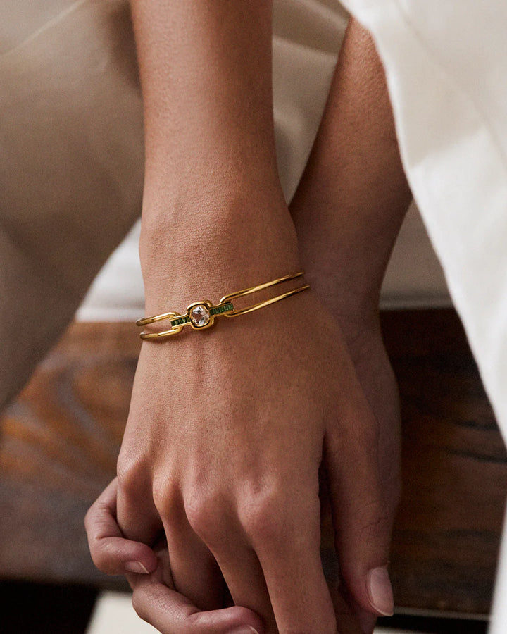 Crafted in 14ct gold vermeil on certified recycled sterling silver, the Gaia Bangle redefines understated luxury. At its heart lies a brilliant cut white topaz stone nestled within a bold, chubby bezel setting, highlighted by channel-set baguette cut green cubic zirconia stones. The bangle itself incorporates negative space through the openwork split band. The result is a harmonious balance of vintage detailing and modern simplicity.