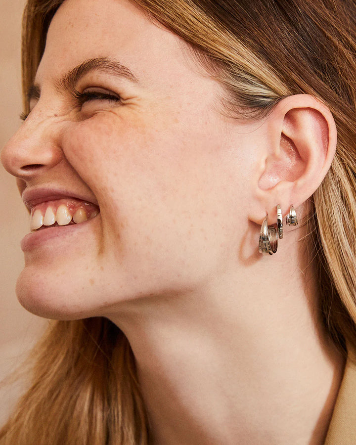The ridged edges of the Angelina Chunky Hoop Earrings in Silver emulate the intricate glass cuttings of vintage perfume bottles. They can be dressed up or down with their bold yet wearable design. These earrings are composed of 925 sterling silver and stamped with the signature Laura Vann logo. Fitted with a post and butterfly fastening for pierced ears.