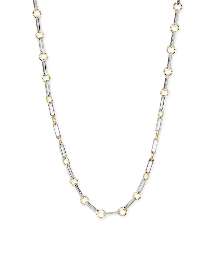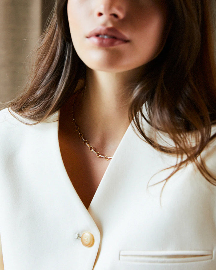 Ideal for those seeking a fusion of cool and warm-toned jewellery, this necklace exudes sophistication and versatility. Featuring a unique design of intricately twisted gold rings juxtaposed with polished oblong silver links, this piece is a must-have whether worn solo as a statement piece or layered with other V favourites. Customize your look further by adding white topaz charms.