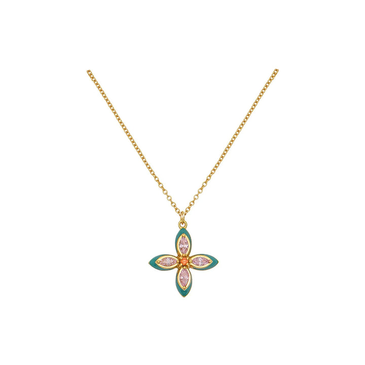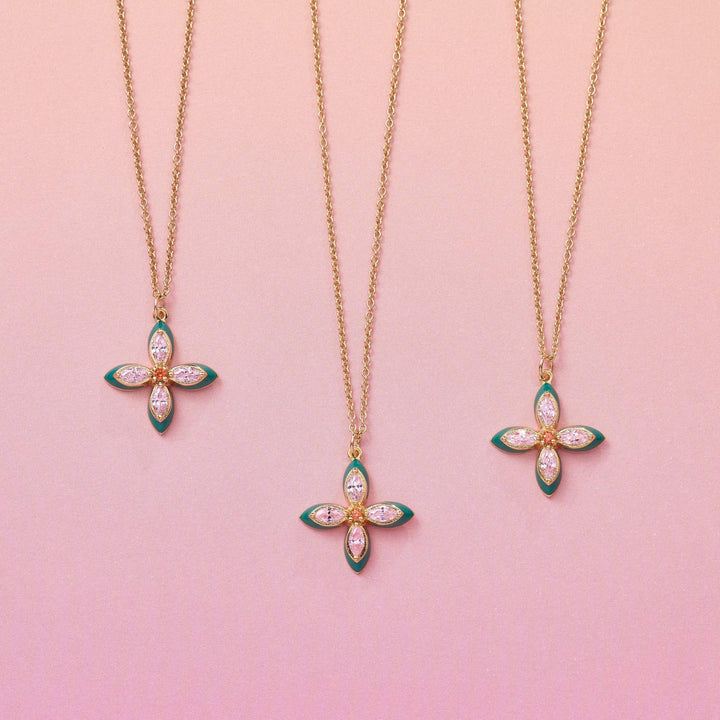 Inspired by the magic of lucky charms and four leaf clovers, this luxurious pendant necklace is adorned with a radiant lab grown cubic zirconia and delicate emerald green enamel embellished clover motif. Each clover piece has been meticulously hand-painted with enamel and then set with lab grown blush pink and orange cubic zirconia.