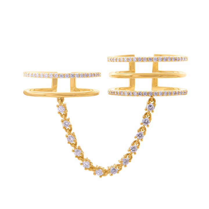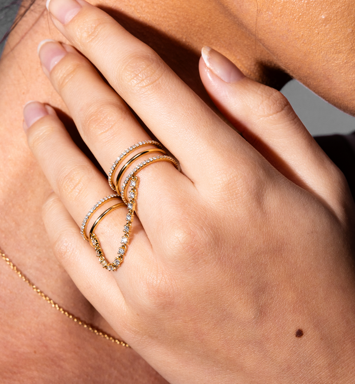 Immerse yourself in the grandeur of the Empire Double Ring, a captivating masterpiece within Lucy Quartermaine’s Empire Collection. Crafted from solid Italian gold and adorned with natural diamonds, the Empire Double Ring features two rings joined by a chain of opulent gold and diamonds, symbolizing a powerful union of elegance and grandeur.